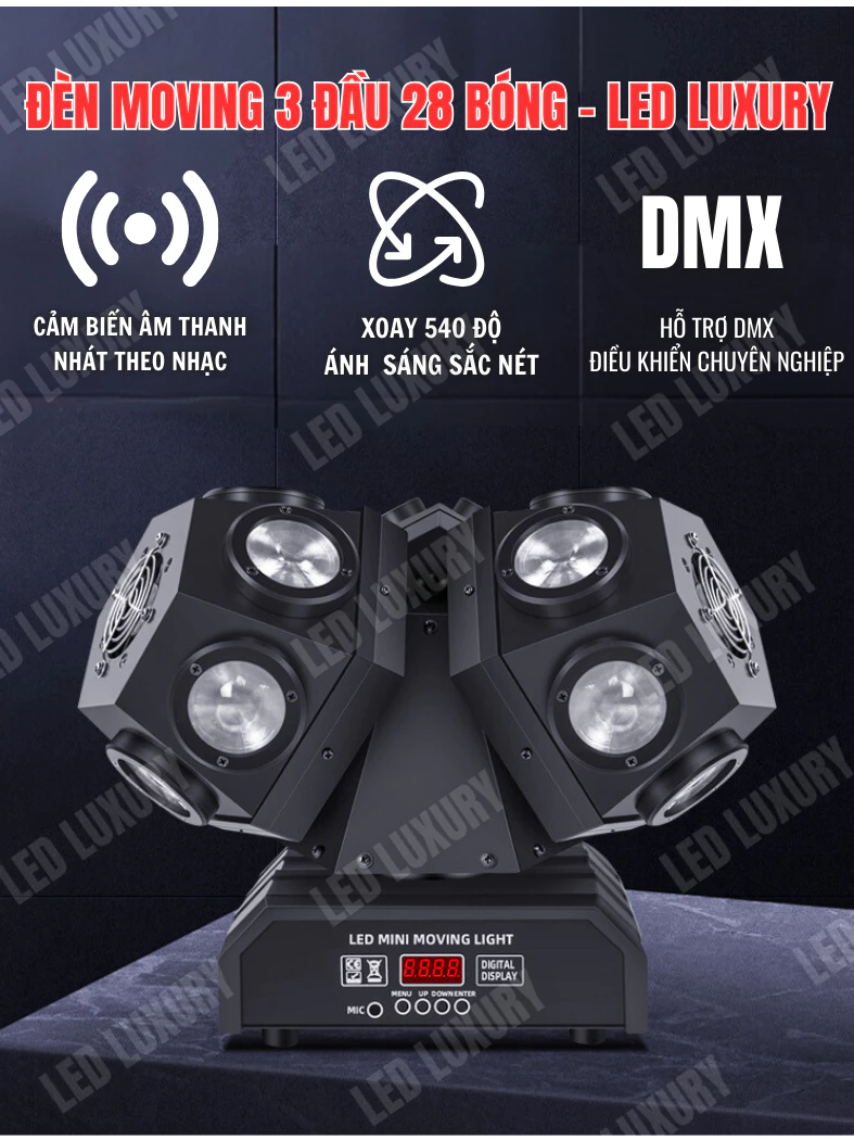 Đèn moving 3 đầu 28 bóng LED LUXURY Bản nâng cấp Hiệu ứng đa dạng Cho Phòng Karaoke, Vũ trường, Sự kiện,…